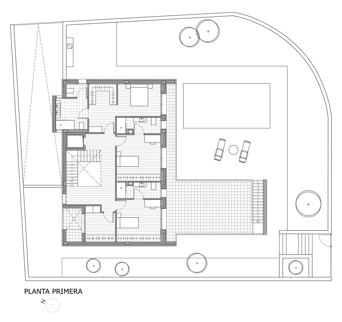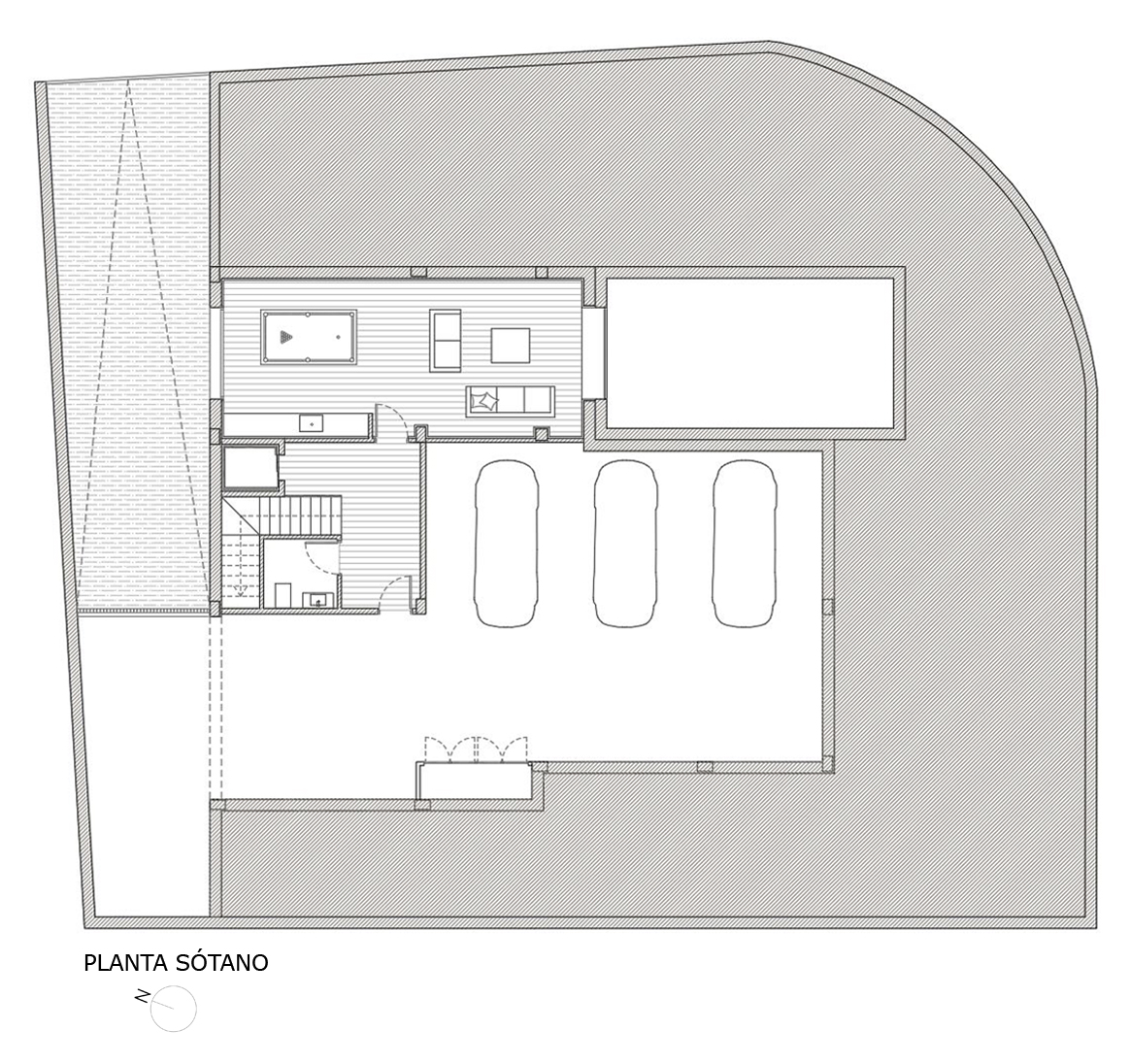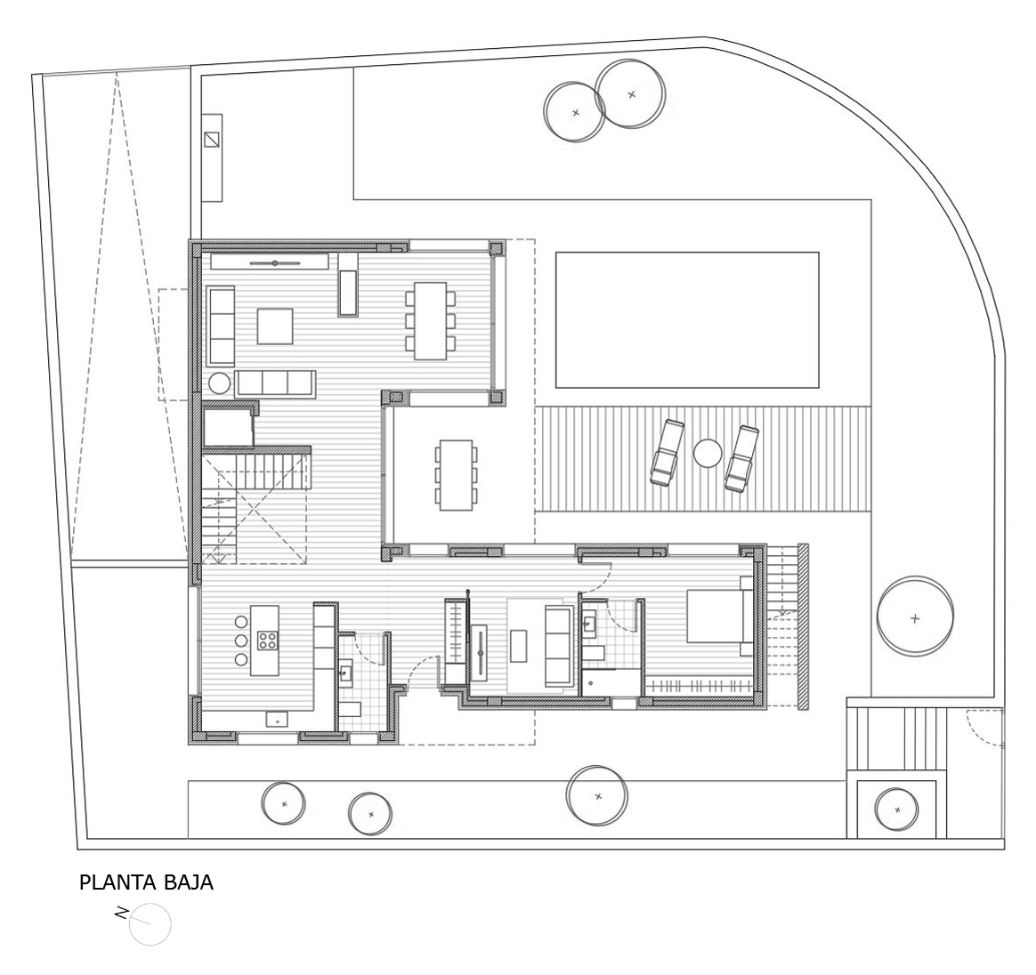 En planta baja la casa se organiza en forma de L al rededor de una piscina que a su vez dará luz a la sala polivalente situada en el sótano.